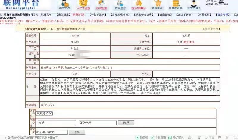 劉女士在反饋件上寫到:各位相關(guān)領(lǐng)導(dǎo),你們好!事情的經(jīng)過是這樣:我母親早晨在鐵西八家子等車,由于不知道八家子這個站點已經(jīng)不停站,等了30多分鐘,經(jīng)過好心人的提醒就往前一站行走,由于早晨天氣特別冷,老人在行走的途中就看見一輛410公交車,一路小跑,其實這時車已經(jīng)到達(dá)站點,本可以開走,但是看到我母親一路小跑還帶那么多東西,在車站等待我母親上車才開走,如果司機(jī)師傅不停車等待,在寒風(fēng)瑟瑟的早晨,我母親不知道又要等待多久!我母親在車上多次感謝司機(jī),并要詢問姓名表示一定要寫感想信,但司機(jī)師傅卻做好事不留名,這是一種什么精神!我覺得新時代鞍山應(yīng)該需要這樣為老百姓著想還不留名的好司機(jī)!我為他點贊!也懇請公交公司的領(lǐng)導(dǎo)多宣揚這個人的事跡,為寒風(fēng)瑟瑟的秋季增加一絲溫暖!車牌號碼是遼CD1503,早晨7點28分到的二十六中學(xué)車站(八家子方向開來)。